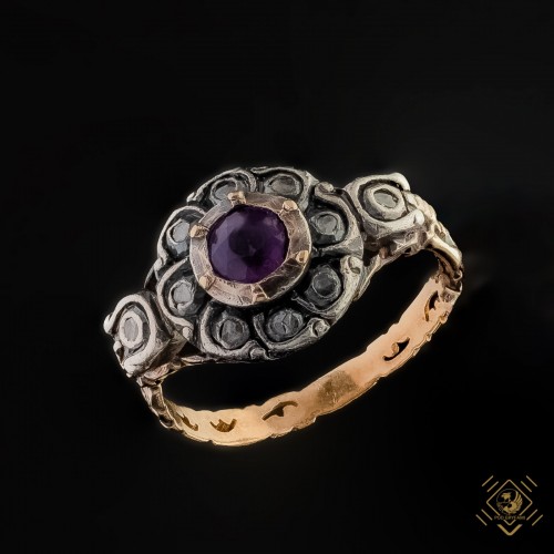 Majestatyczny pierścień będący przykładem rzadko już spotykanego historycznego egzemplarza kolekcjonerskiego. Wykonany prawdopodobnie na początku XIX wieku z wyraźnym rysem charakterystycznym dla biżuterii barokowej. Centralnie umieszczony ametyst oraz otaczające go rozety diamentowe osadzone w srebrze. Podstawa oraz floralnie zdobiona obrączka wykonane ze złota wysokiej 19 karatowej próby.