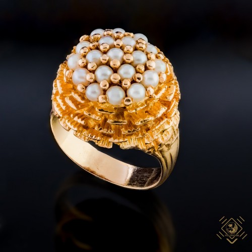 Wspaniała kopułowa konstrukcja ozdobiona niewielkimi perełkami głębinowymi przetykanymi drobnymi złotymi kulkami. Oryginalna perłowa dekoracja połączona z kunsztem jubilerskiej pracy w cyzelowanym złocie.