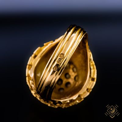 A magnificent dome ring decorated with small deep-sea pearls interspersed with tiny golden balls. Original pearl decoration is combined with chiselled gold jewelry craftsmanship.