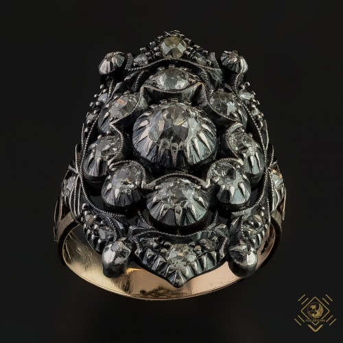 Oryginalna forma wielostopniowej lekko spłaszczonej i wydłużonej przestrzennej rozety kwiatowej. Diamenty starego szlifu ( old mine cut ) oraz rozety diamentowe oprawione w spatynowane srebro łączone z wysokiej próby złotem. Wspaniała praca jubilerska świadcząca o doskonałym kunszcie złotnika.
