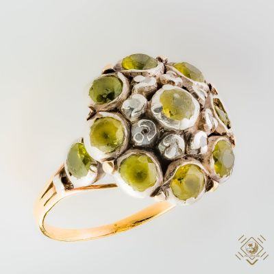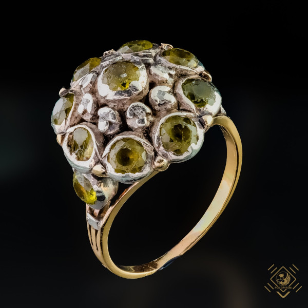 A historical collector's piece, rarely found on the antique jewelery market. Featuring an impressive bump with diamond rosettes, and olive-coloured glass that was often used in jewelry decorating in the late eighteenth century. Stones placed in a setting made of silver combined with a ring of high 19 carat gold.