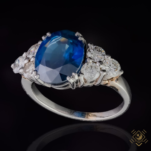 Prosta platynowa oprawa, której zadaniem jest wyeksponować pięcio-karatowy szafir osadzony w towarzystwie idealnie dobranych diamentów. Doskonała brylancja kamieni wspaniale podkreśla głęboki błękit korundu.