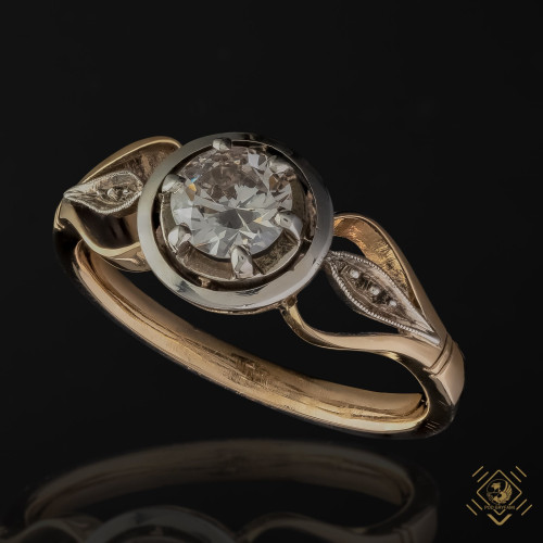 Diament w starym szlifie brylantowym ( old european cut ) ujęty w łapki na bazie delikatnej złotej konstrukcji. Wspaniała brylancja kamienia podkreślona finezyjną oprawą.