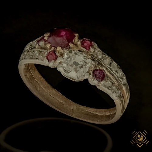 Prosta forma obrączki wspaniale podkreśla urodę niewielkiego rubinu o pięknie nasyconej czerwonej barwie z lekkim odcieniem różu. Połączenie srebra ze złotem w oprawie z delikatnym blaskiem diamentu starego szlifu ( old mine cut ) oraz rozet diamentowych stanowi dopełnienie całości. Niezwykle kobiecy, subtelny klejnocik.
