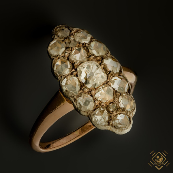 A charming Marquise Ring - a mandorla shape with a wonderful openwork structure that illuminates the stones from all sides and thus presents the whole magic of the old mine cut diamond, and the diamond rosettes surrounding it. A simple, timeless form. The precision of workmanship, and the beauty of the stones make the gem a perfect part of any collection of old jewelry.
