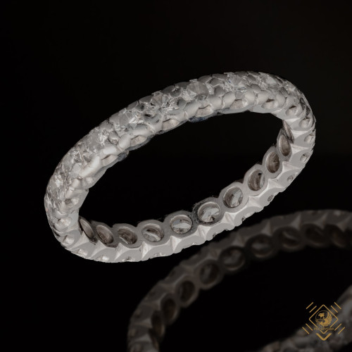 Obrączka wykonana z platyny kameryzowana diamentami o identycznym szlifie. Ciekawe osadzenie diamentów zapewnia kamieniom odpowiednie światło podkreślając ich wspaniały blask.
