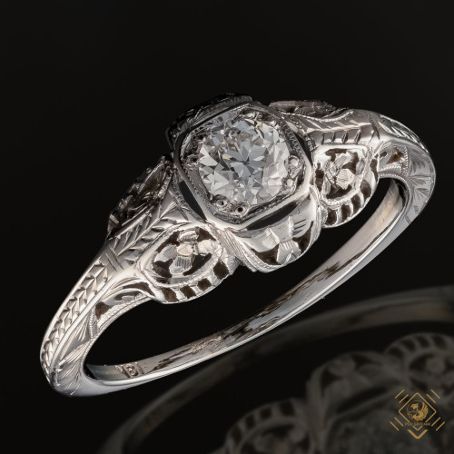 Delikatna ażurowa oprawa podkreśla urodę diamentu o starym szlifie ( old european cut ).