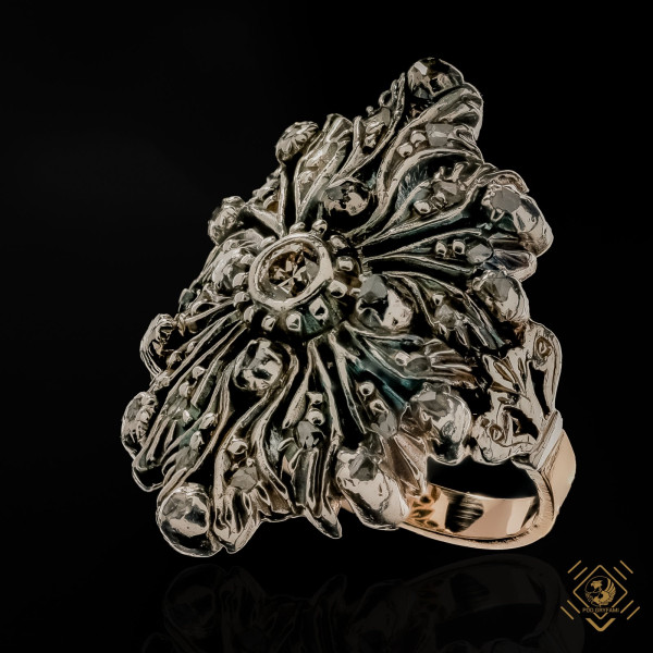 Featuring an original flattened and elongated flower rosette form. The central diamond is accompanied by numerous diamond rosettes set in silver, combined with gold. A wonderful piece of goldsmith work that perfectly decorates the hand.