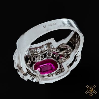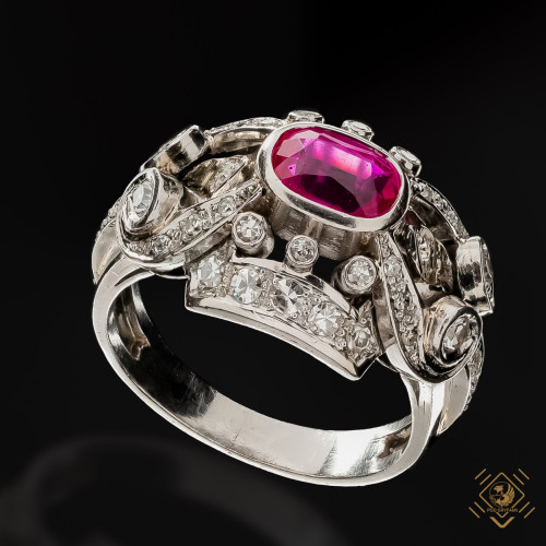 Oficjalnie za kres epoki Art Deco przyjmuje się rok 1939 ale jej reminiscencje odnajdujemy również w latach 40 i 50-tych XX wieku. Czego znakomitym przykładem jest ten wspaniały pierścionek, który został wykonany na przełomie lat 40 i 50-tych XX wieku. Złotnik zaprojektował go w formie fantazyjnych, geometryzujących elementów połączonych ze sobą z idealnie symetryczną harmonią. Centralny punkt stanowi jedno karatowy różowy szafir pozyskany metodą Verneuila pozostający w otoczeniu diamentów o doskonałej dyspersji podkreślonej delikatną bielą platyny.