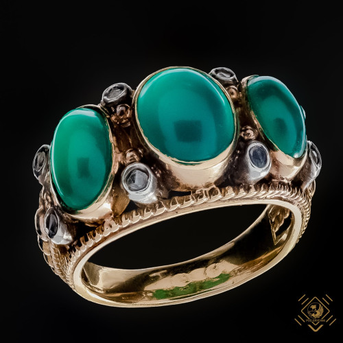Majestatyczny pierścień wykonany na bazie obrączki. W centralnym miejscu osadzone w oprawie ciągłej wspaniałe ciemnozielone chryzoprazy. Chryzopraz to cenna i dosyć rzadka odmiana chalcedonu znajdująca zastosowanie w biżuterii już od najdawniejszych czasów.