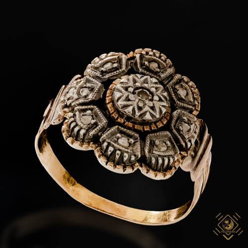 Wspaniała ręczna robota. Kwiat wykonany ze złota z osadzonymi w srebrze rozetami i niewielkim diamentem, którego delikatny blask podkreśla precyzyjnie wycyzelowana gwiazda.