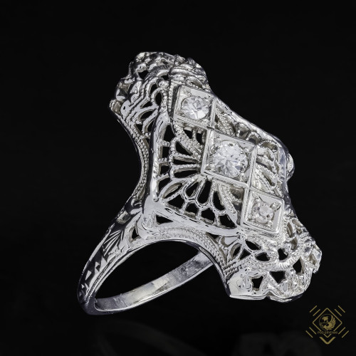 Pierścionek z wyraźnym klimatem epoki Art Deco chociaż wykonany w połowie XX wieku. Lekka ażurowa konstrukcja z pięknie wymodelowanym frontem ozdobionym trzema idealnie dobranymi diamentami. Wspaniała wręcz koronkowa ręczna praca.
