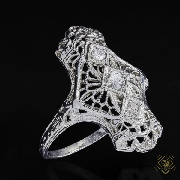 A ring with a distinct Art Deco feel, although made in the mid-20th century. Light openwork construction with a beautifully modeled front decorated with three perfectly matched diamonds. Remarkable, almost lacy handiwork.