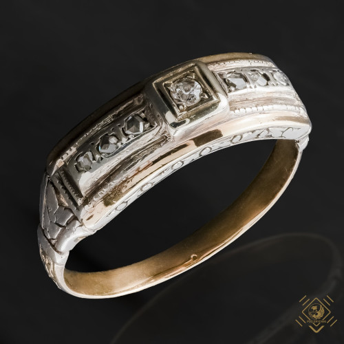 Pierścionek wykonany w estetyce Art Deco nawiązujący konstrukcją do niewielkiej klamry mocującej pasek. Sebrno-złota konstrukcja dekorowana diamentem starego szlifu oraz rozetami diamentowymi. Oryginalnie cyzelowana obrączka oraz osadzenie kamieni sprawiają, że z pozoru masywny pierścionek nabiera lekkości doskonale prezentując się na palcu.