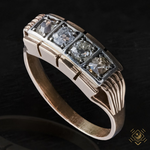 Classic geometric Art Deco ring with old mine cut diamonds. One of the stones in a natural brown color is untreated.