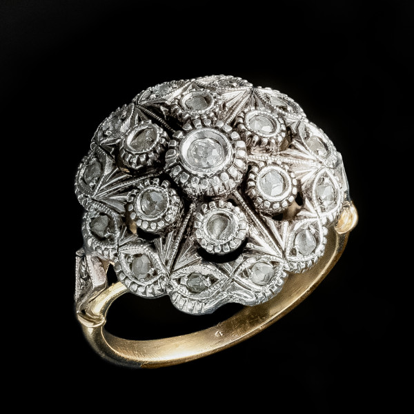 An exceptionally charming multi-stage rosette, the base of which is a beautifully chiseled gold structure. The whole ring is decorated with a centrally placed diamond, as well as delicately shimmering diamond rosettes. A piece of wonderful hand-made jewellery made with the milgrain technique.
