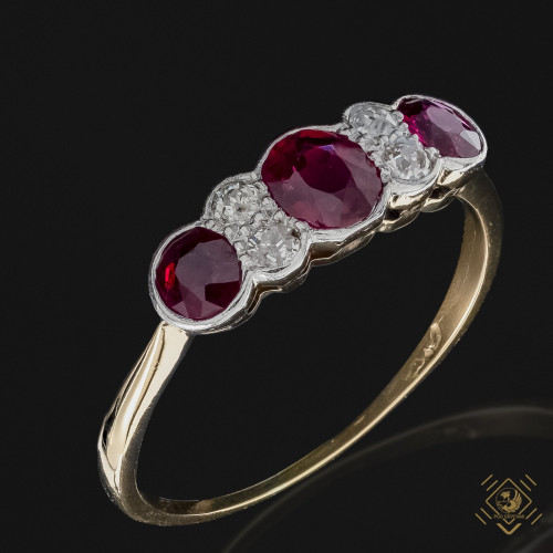 Oprawione w platynę trzy krwistoczerwone rubiny w towarzystwie niewielkich diamentów tworzą delikatny , uroczy zbliżony kształtem do obrączki pierścionek. Skromna, prosta oprawa podkreśla i eksponuje urodę kamieni.