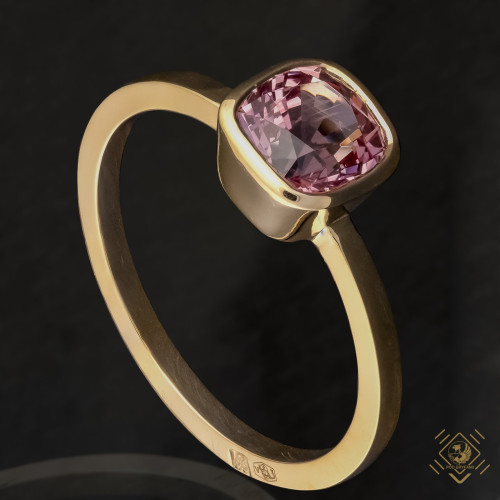 Naturalny, niepoprawiany spinel różowy w klasycznie prostej złotej oprawie. Wspaniała barwa różu z delikatną poświatą fioletu emanuje dobrą energią roztaczając aurę miłości i spokoju.
