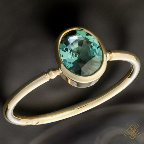 Turmalin ( Verdelit ) w barwie głębokiej ciemno butelkowej zieleni dla której tłem jest niezwykle prosta złota oprawa hipnotyzuje i przyciąga wzrok.