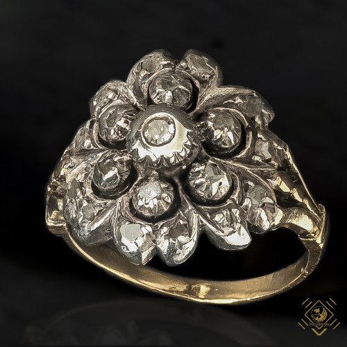 Srebrno-złoty pierścionek wykonany na przełomie XIX i XX wieku. Centralnie osadzony diament starego szlifu ( old mine cut ) zdobi w formie kameryzacji 18 rozet diamentowych. Wspaniała ręczna robota mistrzów złotniczych minionej epoki.