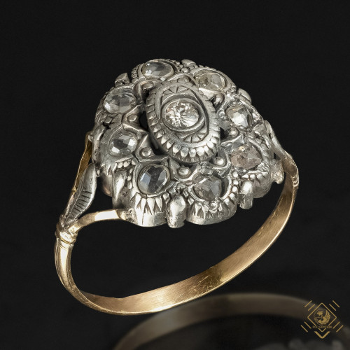 Urocza kwiatowa rozetka posadowiona w srebrno złotej konstrukcji dekorowana diamentem starego szlifu oraz diamentami w szlifach rozet. Wspaniała ręczna praca złotnicza, doskonała ozdoba o motywie florystycznym chętnie i często wykorzystywanym w jubilerstwie.