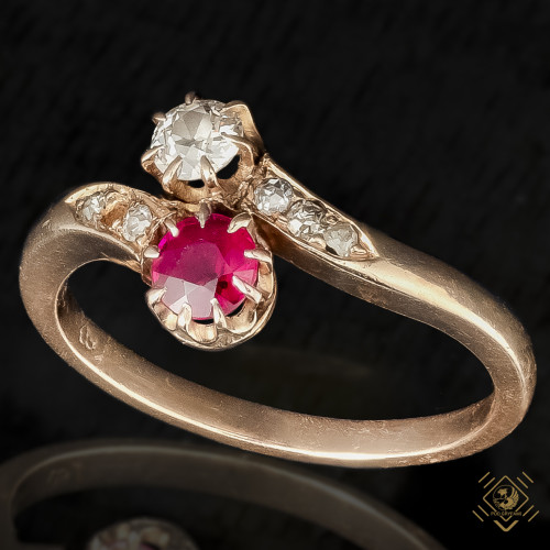 Subtelny, kobiecy wzór ,,Toi et moi " ( z francuskiego Ty i Ja ) gdzie dwa położone blisko siebie kamienie symbolizowały romantyczną miłość kobiety i mężczyzny. Pierścionek dekorowany diamentami i rubinem syntetycznym. Na wewnętrznej stronie obrączki historyczne punce Austro-Węgierskie bite w latach 1872-1922. W zdobieniu wpuszczonym w obrączkę od strony rubinu brak jednego diamentu.
