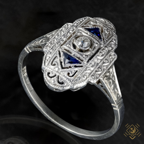 Pierścionek wykonany w połowie XX wieku znakomicie jednak oddający estetykę Art Deco. Wspaniała geometryczna wykonana z platyny forma zdobiona techniką millegrainu. Centralnie osadzony diament w towarzystwie naturalnych szafirów w szlifach triangle.