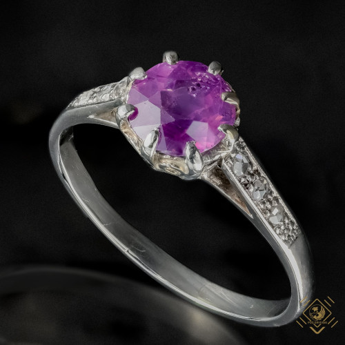 Prosta wykonana z platyny oprawa ma za zadanie wyeksponować wspaniały, naturalny szafir o niezwykłej różowo-fioletowej barwie. Całości dopełniają umieszczone w bocznych częściach obrączki diamenty w szlifach rozet. Różowy szafir to niezwykła i dość rzadka odmiana korundu z domieszką chromu i wanadu.