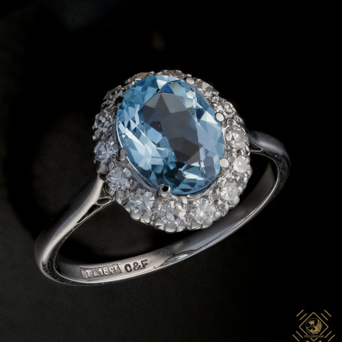 Klasyczna markiza z centralnie osadzonym akwamarynem, którego barwę podkreślają otaczające go diamenty. Całość oprawiona w platynę połączoną z białym złotem.