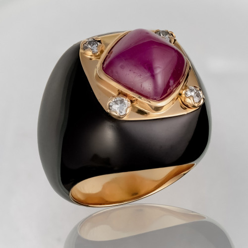 Dodatkowo cztery rozmieszczone symetrycznie diamenty podkreślają jego głęboką purpurowo-czerwoną barwę. Całość osadzona w bakelicie - jednym z najstarszych tworzyw sztucznych bardzo chętnie wykorzystywanych w biżuterii okresu Art Deco. Absolutne ,,Haute Couture" jubilerstwa zajmujące się tworzeniem luksusowych klejnotów na zamówienie.