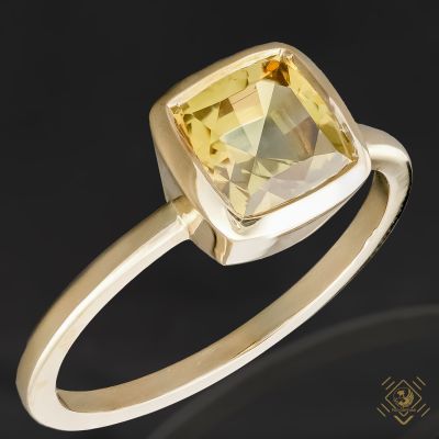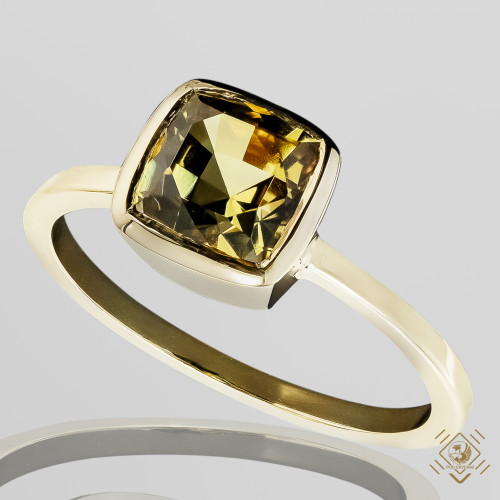 Majestatyczny chrysos ( z greki - złoty) beryllos ( z greki - beryl ) czyli chryzoberyl dla którego tłem jest bardzo prosta złota oprawa mieni się niezwykłą zielonkawo-złotą barwą. Kamień o doskonałej dyspersji uzyskanej dzięki zastosowaniu mieszanego szlifu cushion hipnotyzuje urodą.