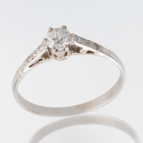 Pierścionek w typie zaręczynowym , centralnie osadzony w łapkach diament w szlifie single cut zdobiony z każdej strony trzema mniejszymi diamentami.Konstrukcja wykonana z platyny łączonej ze złotem.