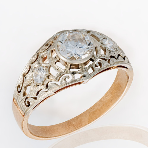 Delikatna ażurowa konstrukcja zdobiona techniką millegrainu ma za zadanie podkreślić urodę centralnie osadzonego w oprawie ciągłej diamentu. Dodatkowo blasku całości dodają dwa osadzone po bokach niewielkie diamenty w historycznych szlifach ( old mine cut ).