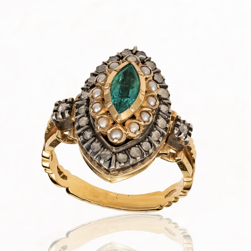 Urzekająca forma mandorli ozdobionej szmaragdem w szlifie markizy oraz niewielkimi delikatnymi perełkami guzikowymi, których piękną kremową barwę podkreślają dyskretnie połyskujące diamenty w szlifach rozet. Całość ujęta w srebrno złotą oprawę typu abgedeckt - kasetową, zamkniętą. Pięknie wycyzelowana obrączka. Majstersztyk ręcznej pracy złotniczej.
