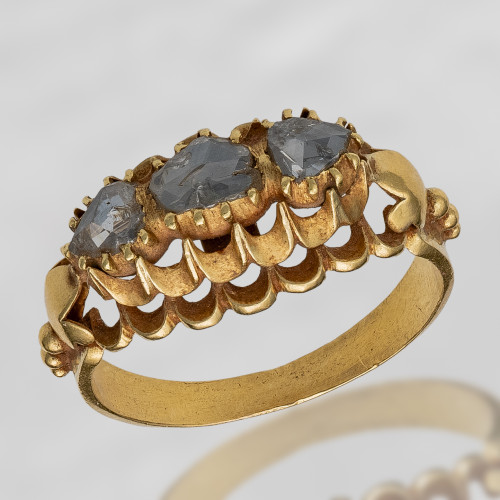 Niecodzienna triada w ręcznej pracy złotniczej wykonana z użyciem wysokiej próby złota. Pieczołowicie zakute w oprawę zamkniętą trzy wspaniałe rozety diamentowe, których subtelny blask wspaniale koresponduje z ciepłą barwą starego złota.