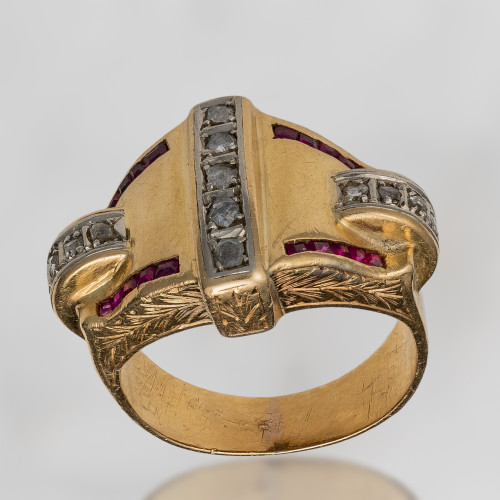 Rzadko spotykana konstrukcja pierścionka nawiązująca w swojej formie do niezwykle lekkiego sygnetu charakterystycznego dla epoki Art Deco. Biel połyskujących rozet diamentowych przełamana głęboko nasyconą czerwoną barwą historycznej syntezy rubinów. Dodatkowo zdobienie obrączki cyzelunkiem z motywem wawrzynu szlachetnego. Wszystko to świadczy o wysokim kunszcie artystycznym mistrza złotnictwa minionej epoki.