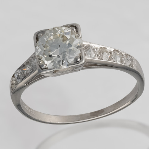 Klasyka pracy w platynie. Prosta konstrukcja, której niezaprzeczalną ozdobą jest centralnie osadzony ponad karatowy diament w historycznym szlifie old european cut. Dodatkowo obrączka kameryzowana diamentami w starych szlifach old mine cut. Ponadczasowe piękno diamentów starych szlifów idealne na każdą okazję.