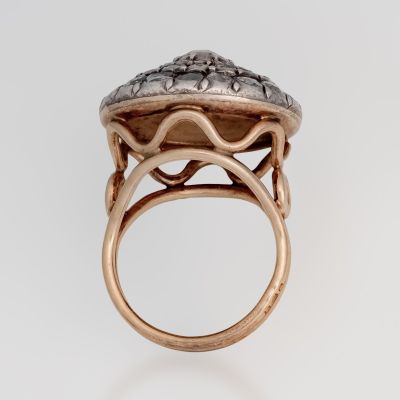 Pierścień w kształcie kopułki, gdzie w starej wykonanej ze srebra oprawie typu abgedeckt ( przykrywającej kamienie ) umieszczono 51 diamentów w szlifie rozetowym. Piękna przestrzenna forma złożona z trzech okręgów diamentów zwieńczonych niezwykle okazałą rozetą w starym szlifie wysokich faset. Obrączka oraz zdobienia boczne wykonane z 18 karatowego złota.