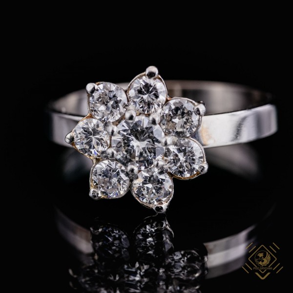 A white gold ring in the form of a daisy flower, whose petals are decorated with carefully selected diamonds. Delicate hand decoration for every day wearing or a night out.