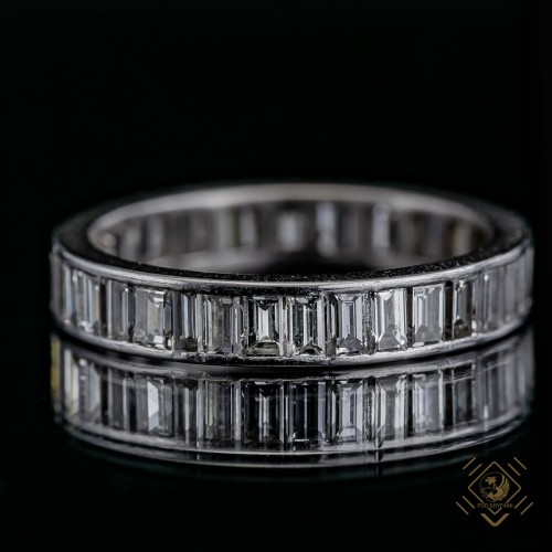 Klasyczna obrączka wykonana z platyny ozdobiona diamentami o szlifie bagiet. Znakomicie prezentuje się na dłoni solo jak i w duecie z innym pierścionkiem.