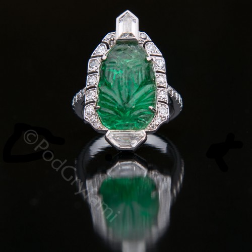 Klasyka Art Deco. Pierścień wykonany z platyny dekorowany diamentami w różnych szlifach oraz rzadko spotykanym grawerowanym szmaragdem o szlifie tarczowym modyfikowanym. Szmaragd w jednym punkcie uzupełniony.