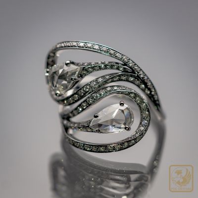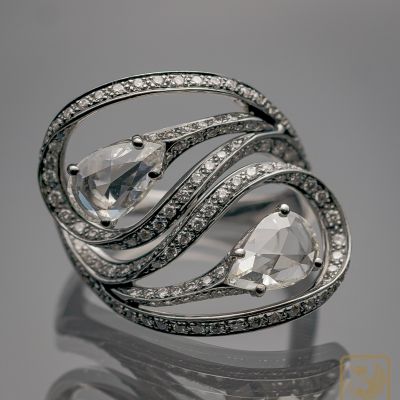 Piękny zaręczynowy pierścionek symbolizujący nieskończoność miłości… Dwie diamentowe rozety, kunsztownie osadzone w ruchomych koronkach, mienią się tysiącem barw rozproszonych promieni światła. Efekt podkreśla cieniowana srebrem złota obrączka obsadzona brylancikami.