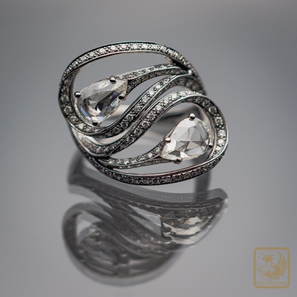 A beautiful engagement ring symbolizing the infinity of love... Two diamond rosettes, artistically set in moving laces, sparkle with thousands of colors of scattered rays of light. The effect is emphasized by a silver-plated gold ring with diamonds.
