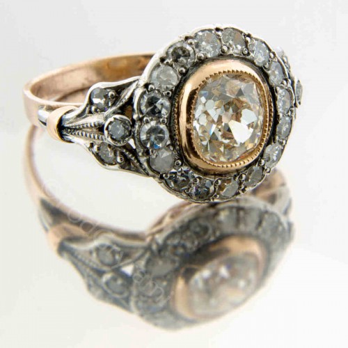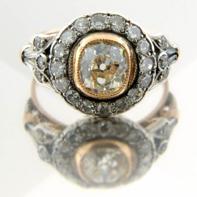 Klejnot z ,,duszą”. Ponad półtora karatowy diament (1,70ct) o szlifie old mine osadzony centralnie w oprawie ciągłej ozdobiony 22 sztukami diamencików oprawionych w korny. Całości dodaje smaczku punca wiedeńska z lat 20-tych XX wieku świadcząca o tym,że pierścionek ,,skomponował” jeden z wiedeńskich wirtuozów jubilerskich. Proweniencja: Wiedeń