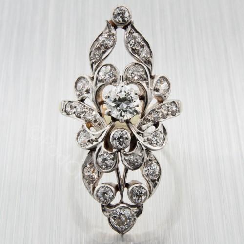 Przepiękny secesyjny pierścień wykonany około 1910 roku. Diamenty o starym szlifie europejskim osadzone w platynie. Korpus pierścionka wykonany ze złota próby 750.Wyjątek stanowi spodnia oprawa czterech kamieni wykonana ze złota próby 570.