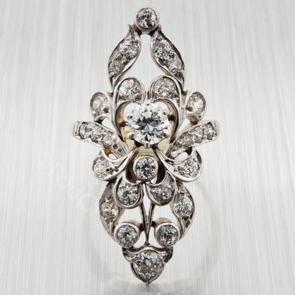 A beautiful Art Nouveau object made around 1910. Old European cut diamonds set in platinum. The body of the ring is made of gold (750), except for the bottom frame of four stones, made of 570 gold. Jewelry has accompanied man through the ages, and each era has worked out its own distinct style. Around 1900, the time of the Belle Epoque, Art Nouveau was that style. It was then that jewelry took one of its most beautiful forms in the history of gold-smithery, imitating nature and taking all types of plant and zoological shapes. This piece is based on motifs of branches and flower cups, with decorative vines and stylized leaves. The quintessence of Art Nouveau was absolute unique, combining precious metals with beautiful stones.