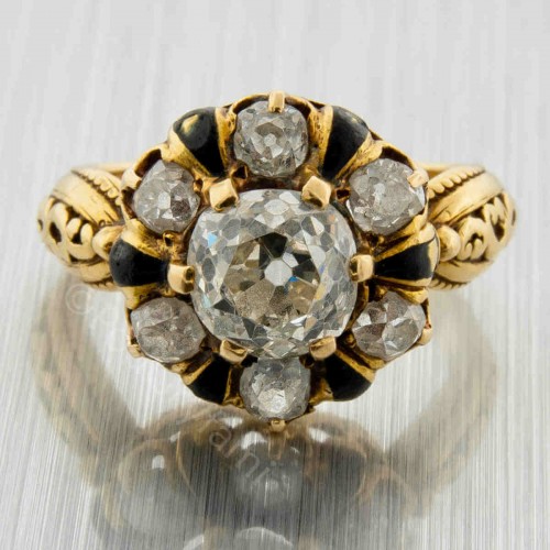 Niezwykle delikatnej urody pierścionek wykonany ze złota ok 18 karatowego z diamentami o starym szlifie (old mine) ozdobiony czarną emalią. Od wewnątrz umieszczona grawerka z dedykacją: Kate TB(?) Johnson-Theodora 1864. Wygrawerowana data sugeruje,że klejnot powstał w okresie wiktoriańskim charakteryzującym się wzrastającą zamożnością , dobrobytem i rozwojem nowych technologii. Biżuterię z tego czasu można podzielić na trzy okresy (1837-1855). Romantyczny, (1856-1880) Wielki oraz (1880 – 1900) Estetyczny. W drugim okresie tzw Wielkim powstały najbardziej efektowne precjoza inspirowane motywami Dalekiego Wschodu. Do ich wyrobu oprócz diamentów używano kamieni szlachetnych o ciemnych, stonowanych barwach oraz emalii o wszelkich odcieniach czerni. Tak więc, jest to typowo wiktoriański wyrób a dodając do tego fakt iż pierścionek był eksponowany na wystawie w Nowojorskim Muzeum Miejskim można stwierdzić,że jest to wysokiej klasy niepowtarzalny klejnot wykonany na indywidualne zamówienie.