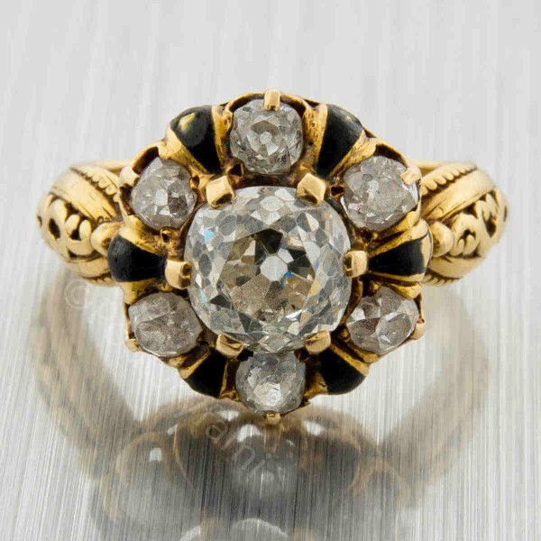 An extremely delicate ring made of approx. 18k gold with old mine cut diamonds and decorated with black enamel. On the inside there is an engraving with a dedication. The engraved date suggests that the jewel was created in the Victorian period, characterized as it was by increasing wealth, prosperity and industrial development. Jewelry from this period can be divided into three periods: Romantic (1837-1855), Great (1856-1880) and Aesthetic (1880-1900). In the second half of the so-called Great Period, the most impressive preciosity inspired by the aesthetics of the Far East was created. Apart from diamonds, precious stones of dark, subdued colors and enamels of all shades were used for production. Thus, this piece is a typical Victorian product. Adding to the fact that the ring was on display at the Museum of the City of New York, we can say with certainty that it is a highly unique jewel, made to order.