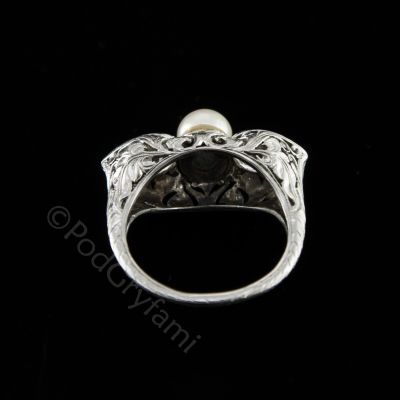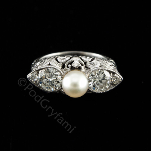 Niewielki klejnot przyciągający uwagę ciekawym nowatorskim kształtem. Platynowa wijąca się niczym liana wokół palca obrączka w górnej części przechodzi w ażurowy, floralny ornament. Kunszt mistrza złotniczego objawia się w cyzelunku uwidaczniającym delikatne żyłki tzw unerwienie filigranowo giętych listków. Ciekawie osadzone brylanty tworzące jakby dwa płatki kwiatu, którego wypełnieniem jest centralnie osadzona w białym złocie - idealnie okrągła perła. Zachwyca urodą ,,epoki piękna”.