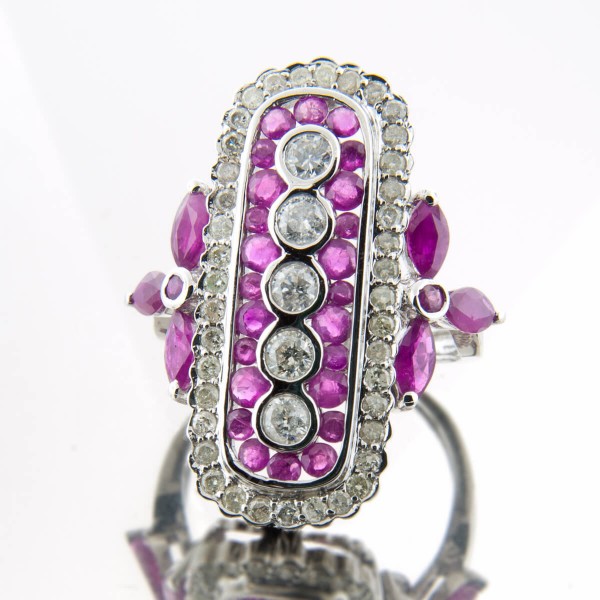 An interesting ring made of white gold, set with diamonds and rubies. The form, although simple, with properly selected and set stones gives the impression of elegant splendor. For women with class, but not devoid of a touch of fantasy.